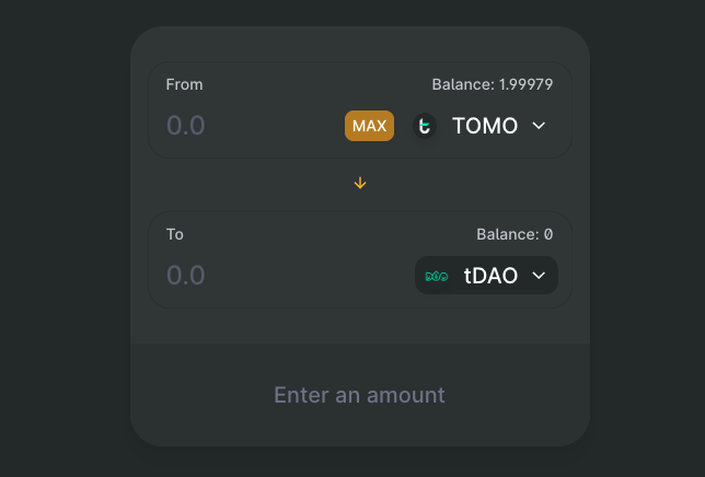 The instruction to make a sway on LuaSwap can be found [here](https://github.com/BuildOnViction/gitbook/blob/main/tomomasterdao/broken-reference/README.md). Please make sure to choose $tDAO as the token you want to swap to.