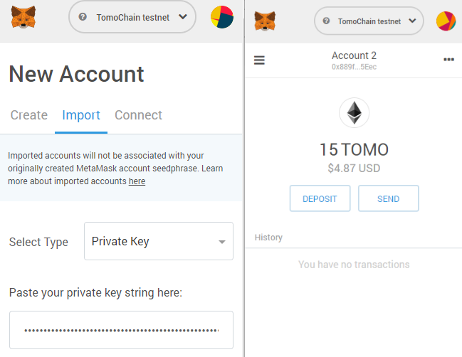 6. The network name at the top will switch to say “Viction testnet”. Now that we are on Viction network we can import Viction wallets.
