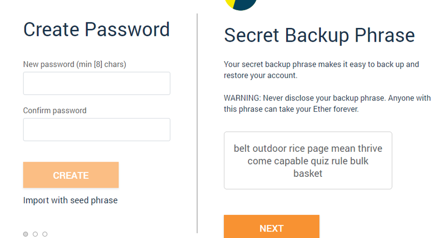 Create a New password. Then, write down the Secret Backup Phrase and accept the terms. By default, MetaMask will create a new Ethereum address for you.