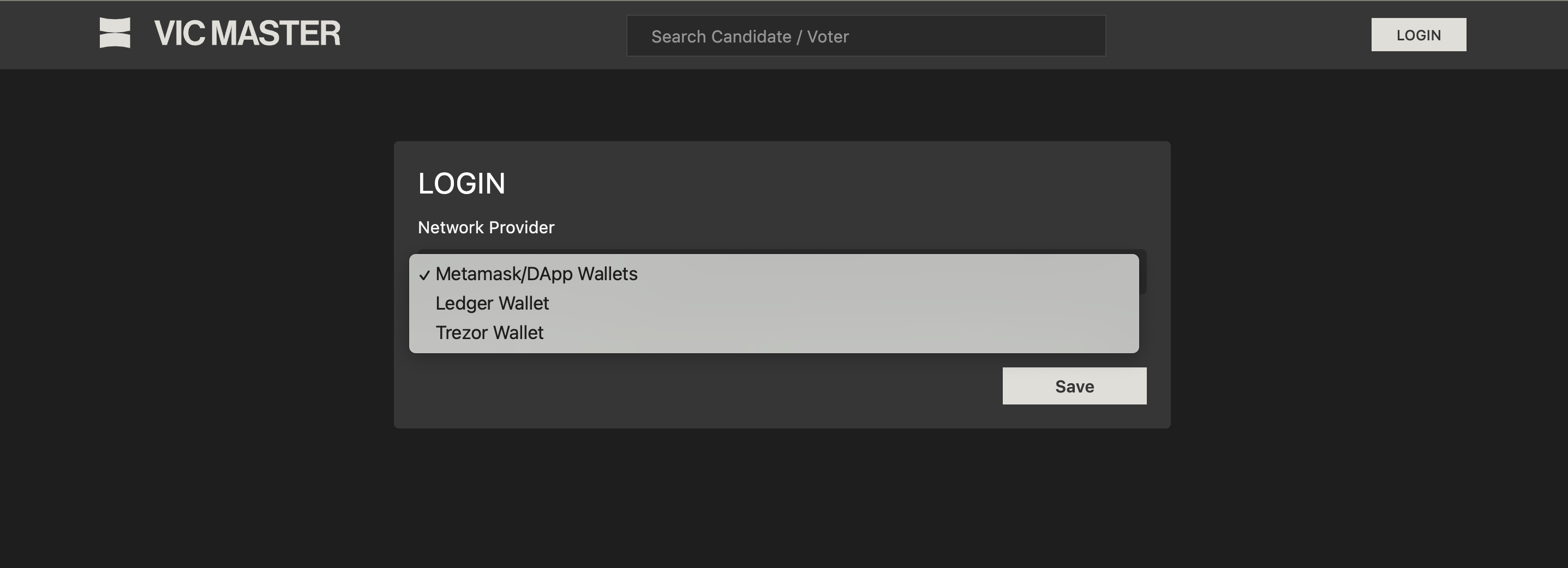 Click the "Login" button. VicMaster natively supports multiple options to login including MetaMask, [Ledger](https://app.gitbook.com/@Viction/s/Viction-docs/general/how-to-connect-to-viction-network/ledger), Trezor, and Private Key/Mnemonic. Select the appropriate option and log in.